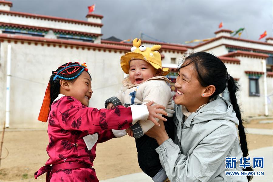 在拉薩市堆龍德慶區(qū)古榮鄉(xiāng)榮瑪高海拔生態(tài)搬遷點,石珍(右)和女兒格桑曲達(左)、兒子嘎瑪曲英在家門口玩耍(4月1日攝)。石珍是榮瑪高海拔生態(tài)搬遷點醫(yī)務(wù)室的村醫(yī),這份工作每月為她帶來2590元收入。新華社記者 詹彥 攝