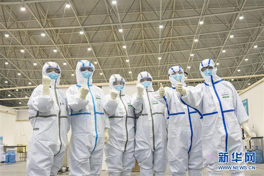 2月10日,在武漢客廳方艙醫(yī)院,幾名醫(yī)護(hù)人員為自己打氣。 新華社記者 熊琦 攝