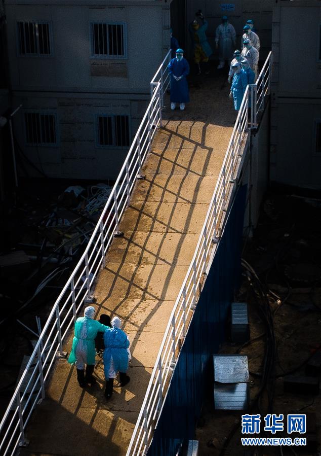 2月4日,醫(yī)護(hù)人員將患者送入武漢火神山醫(yī)院病房(無人機(jī)照片)。 新華社記者肖藝九攝