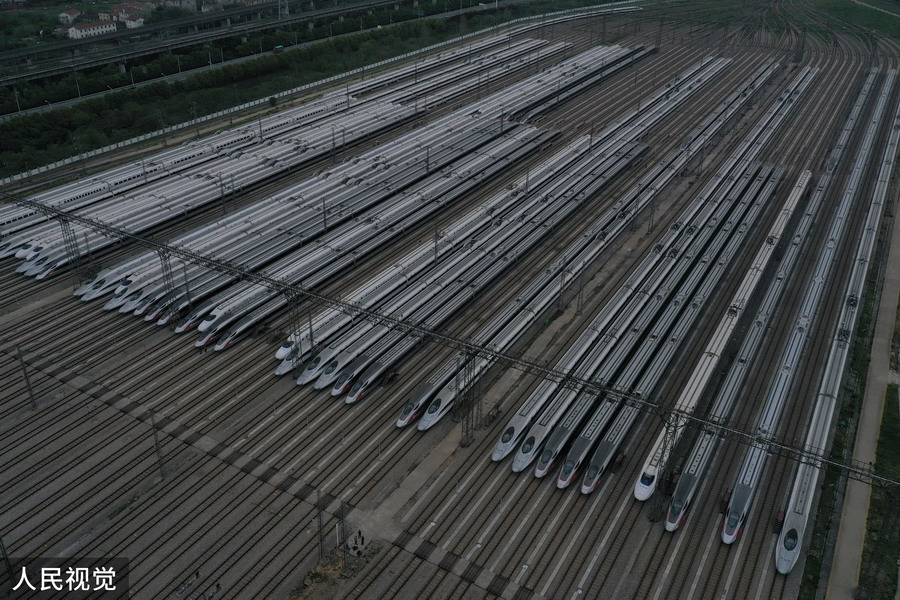 2020年4月6日,武漢動(dòng)車(chē)段高鐵動(dòng)車(chē)組整裝待發(fā)(無(wú)人機(jī)照片)。