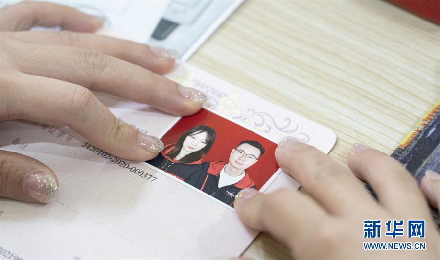4月7日,在武漢市江岸區(qū)民政局婚姻登記處,新人盧先生和丁女士展示結(jié)婚證。 新華社記者才揚(yáng)攝