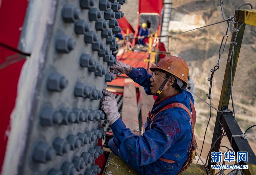 4月8日,中鐵四局的工人黃木貴在進行油漆涂裝。新華社記者江文耀攝