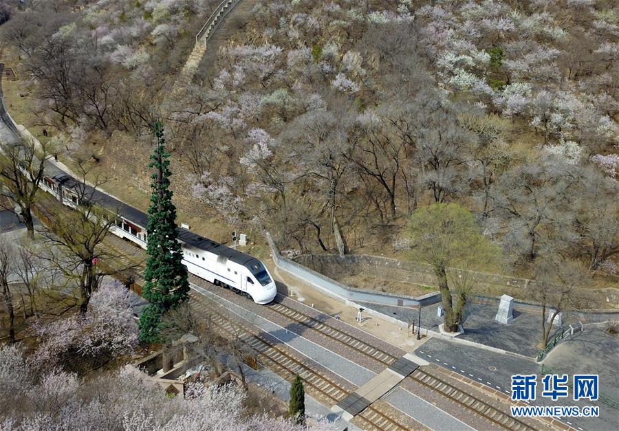 4月8日,北京青龍橋火車站附近春花盛開(無人機照片)。 新華社記者張晨霖攝