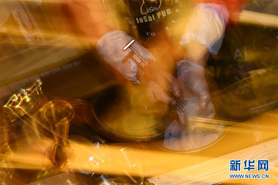 4月8日,才仁俄賽在餐廳內制作調酒使用的冰塊。新華社記者張宏祥攝
