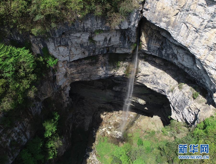 地洞河天坑底部的一處瀑布。新華社張博文攝