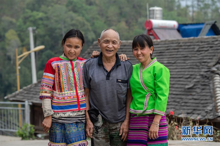 在云南省勐??h布朗山鄉(xiāng)曼囡村曼班三隊,娜四(右)和父親(中)、妹妹在村里合影(4月12日攝)。新華社記者胡超攝