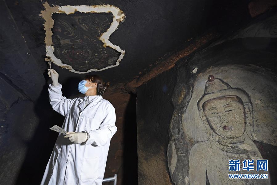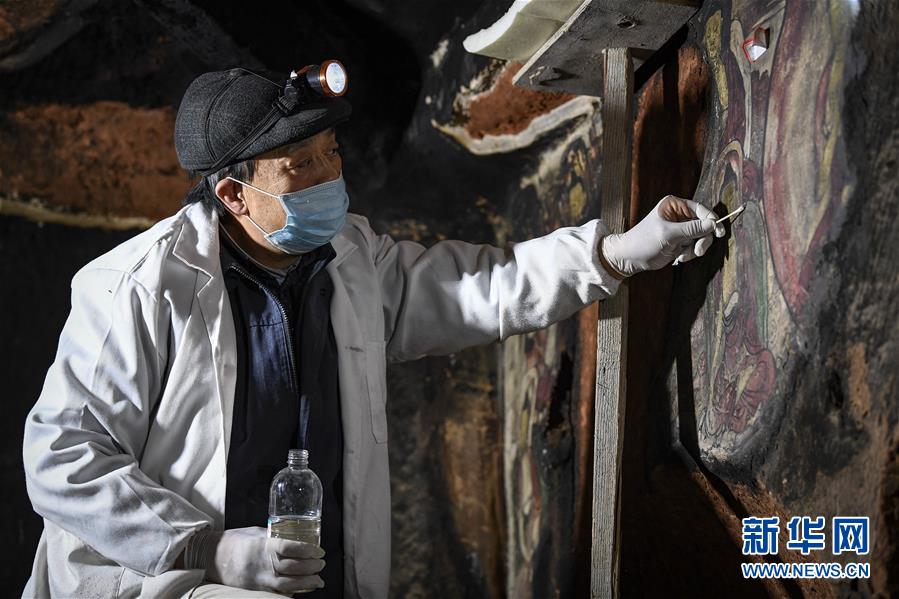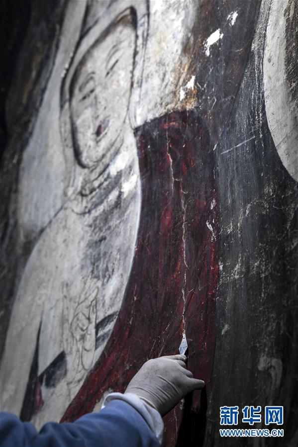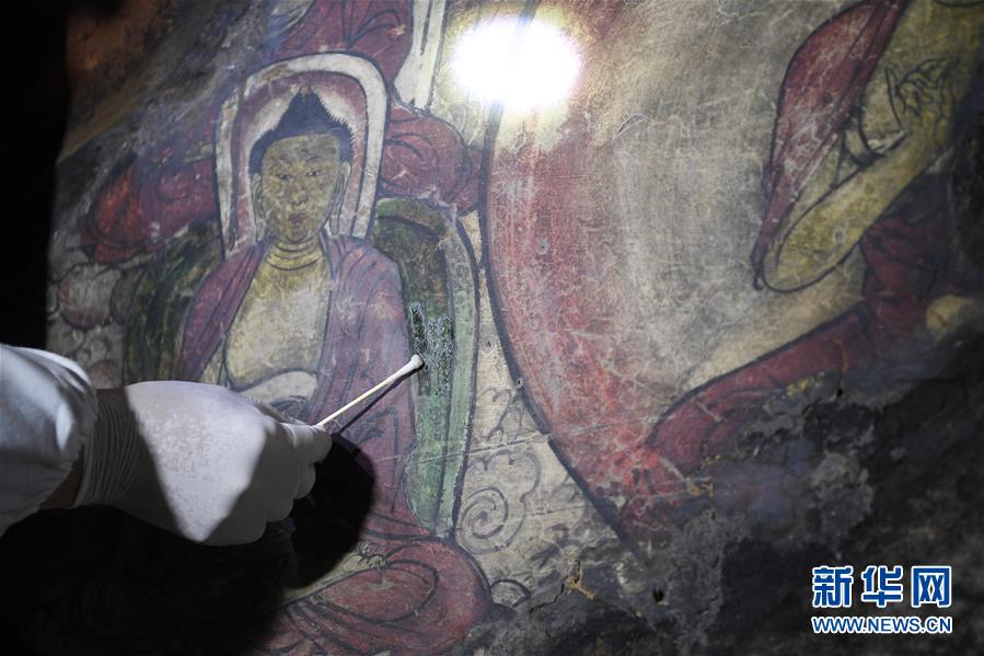 4月27日,文物修復(fù)專家在寧夏須彌山石窟圓光寺48號(hào)窟內(nèi)修復(fù)壁畫。新華社記者王鵬攝