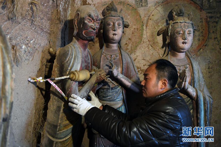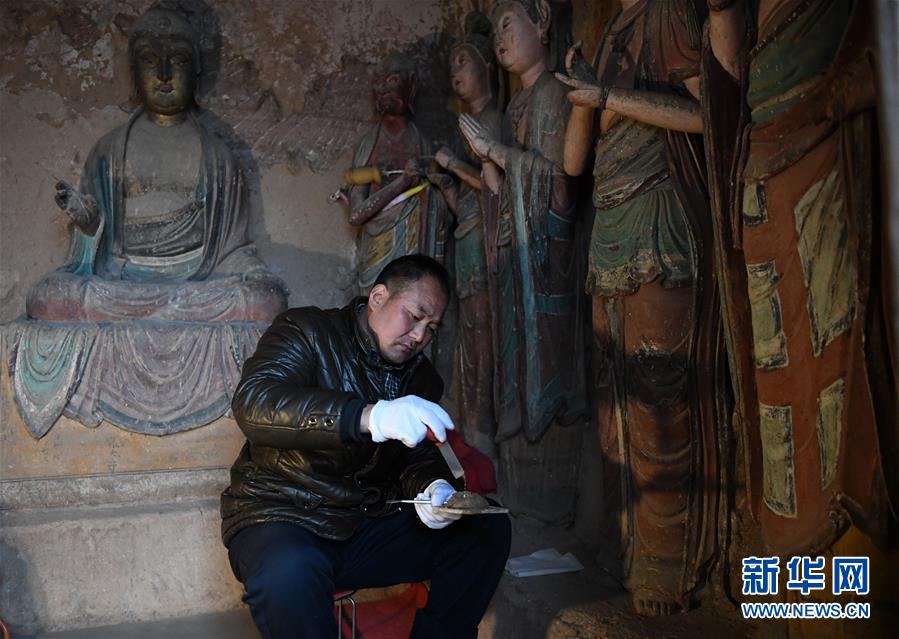 12月25日,在麥積山石窟第11窟,修復(fù)師牟常有對(duì)塑像破損處進(jìn)行加固處理。