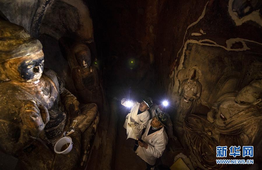 4月27日,文物修復(fù)專家在寧夏須彌山石窟圓光寺48號(hào)窟內(nèi)商量修復(fù)方案。新華社記者馮開華攝