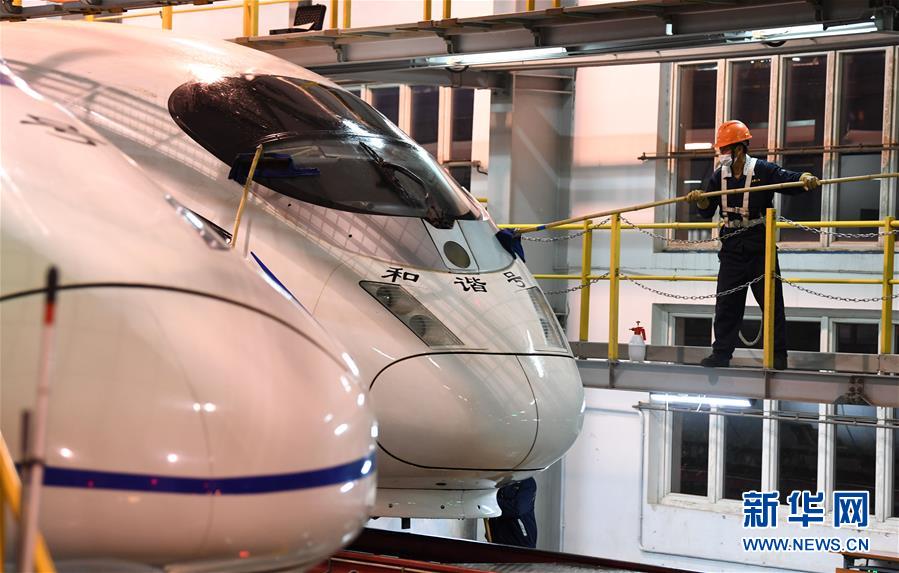 4月29日夜,工作人員在合肥南動車運(yùn)用所內(nèi)對動車組進(jìn)行清潔。每當(dāng)夜深人靜的時候,合肥南動車運(yùn)用所卻燈火通明,“動車安全守護(hù)者”們堅(jiān)守崗位,對動車組進(jìn)行全面細(xì)致檢修。新華社記者 劉軍喜 攝