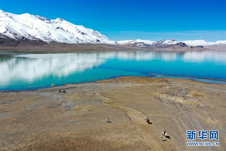 4月30日,牧民在當(dāng)穹錯湖畔騎馬(無人機(jī)照片)。當(dāng)穹錯地處西藏那曲市尼瑪縣南部,湖面海拔4475米。暮春時節(jié),湖水碧藍(lán)清亮,讓人仿佛置身仙境。新華社記者侯捷攝