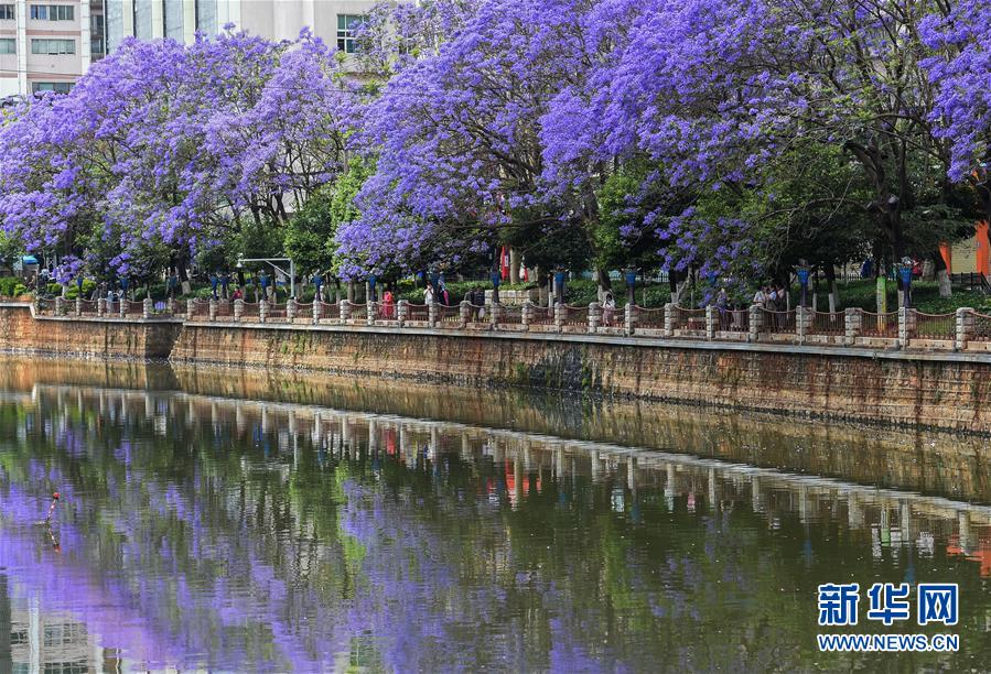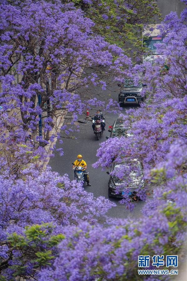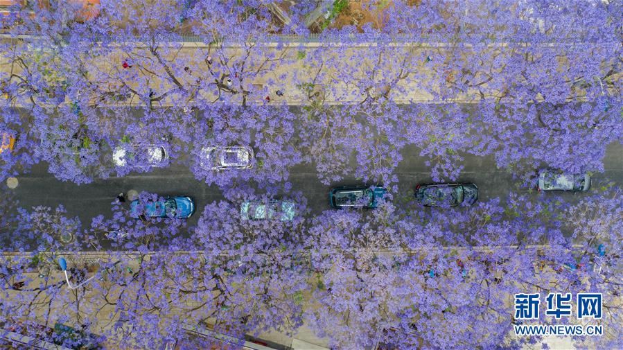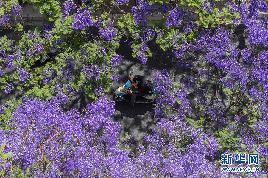 這是5月2日在昆明市桃源街拍攝的藍(lán)花楹。近日,云南省昆明市部分街區(qū)的藍(lán)花楹競(jìng)相開(kāi)放,為春城增添靚麗風(fēng)景。新華社記者藺以光攝