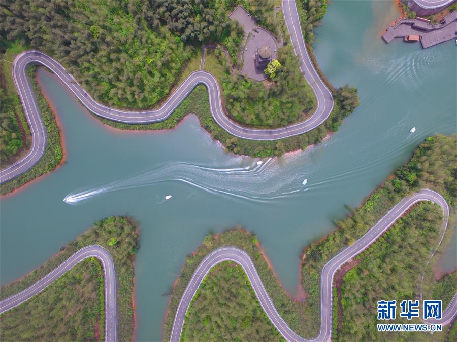 5月1日,在貴州省赤水市竹海國家森林公園里,游客乘坐快艇游覽竹海湖(無人機照片)?!拔逡弧奔偃掌陂g,人們以多種方式放松心情、享受假日。新華社發(fā)(張鵬攝)