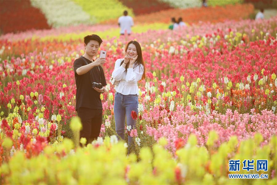 5月1日,游客在四川省遂寧市圣蓮花開景區(qū)的金魚草花海中拍照。“五一”假日期間,人們以多種方式放松心情、享受假日。新華社發(fā)(劉昌松攝)