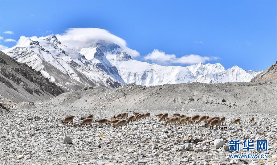 一群巖羊在珠峰大本營(yíng)附近覓食(5月8日攝)。當(dāng)日,一群巖羊在珠峰大本營(yíng)周?chē)捠?,黃嘴山鴉飛到巖羊身上停留,構(gòu)成一幅幅生動(dòng)有趣的雪域圖畫(huà)。新華社記者晉美多吉攝
