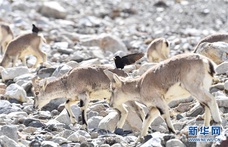 黃嘴山鴉停留在巖羊身上(5月8日攝)。當(dāng)日,一群巖羊在珠峰大本營周圍覓食,黃嘴山鴉飛到巖羊身上停留,構(gòu)成一幅幅生動有趣的雪域圖畫。新華社記者晉美多吉攝