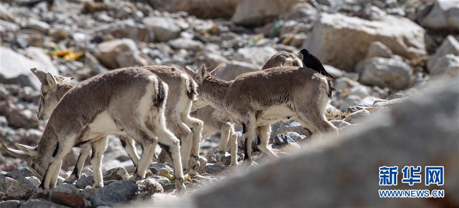 黃嘴山鴉停在巖羊背上(5月8日攝)。當日,一群巖羊在珠峰大本營周圍覓食,黃嘴山鴉飛到巖羊身上停留,構成一幅幅生動有趣的雪域圖畫。新華社記者普布扎西攝