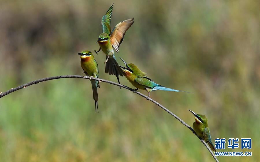 在??谖逶春酉掠畏浠⒈Wo(hù)小區(qū),栗喉蜂虎在嬉戲(5月7日攝)。新華社記者楊冠宇攝