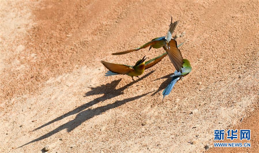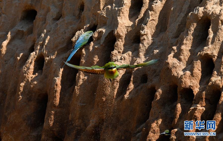 在??谖逶春酉掠畏浠⒈Wo(hù)小區(qū),栗喉蜂虎在沙質(zhì)土坡上起飛(5月7日攝)。新華社記者楊冠宇攝