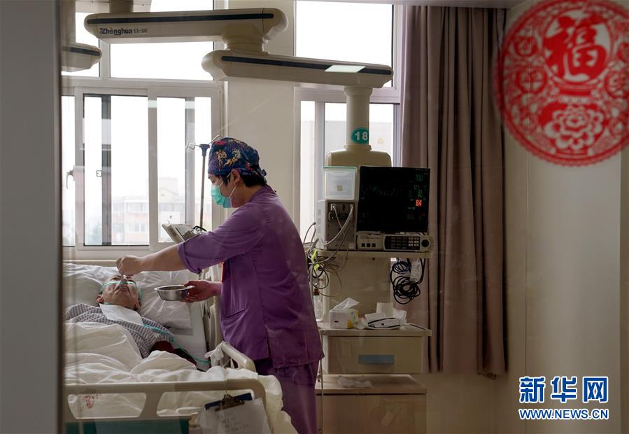 5月10日,在上海市普陀區(qū)中心醫(yī)院內科重癥監(jiān)護室,護士金鑫給患者喂飯。新華社記者劉穎攝
