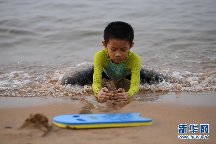 5月10日,小朋友在??谖餍愫┩嫠!=?,海口持續(xù)高溫,不少市民前往海灘戲水消暑。新華社記者蒲曉旭攝