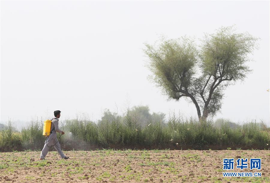 5月9日,在巴基斯坦旁遮普省杰格瓦爾地區(qū),一名工作人員在田間噴灑滅蟲劑。據(jù)巴基斯坦媒體報道,該國旁遮普省和信德省一些地區(qū)近期再次遭遇沙漠蝗蟲侵襲,當(dāng)?shù)卣呀M織民眾進(jìn)行緊急消殺。新華社記者 劉天 攝