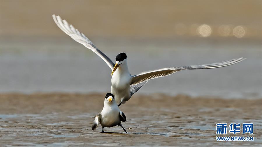 眼下正是大鳳頭燕鷗繁育的時(shí)節(jié),在福建閩江河口濕地核心區(qū)鱔魚(yú)灘的沙洲上,大鳳頭燕鷗正相互嬉戲(5月9日攝)。新華社記者梅永存攝