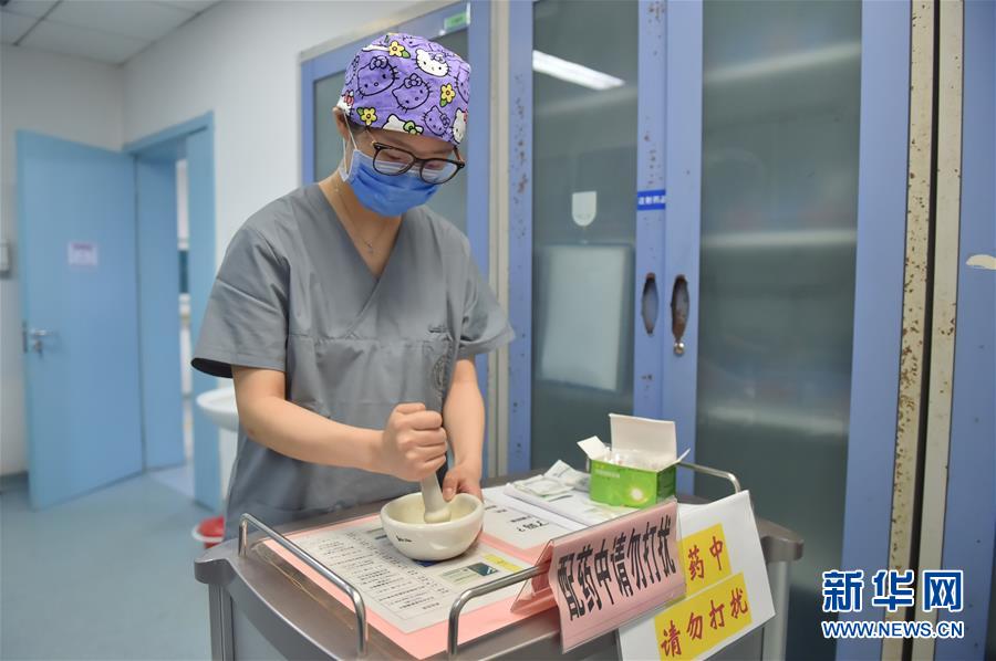 5月11日,在北京地壇醫(yī)院感染二科護(hù)士站,一名護(hù)士為不方便服藥的病人研磨藥片。北京地壇醫(yī)院是北京市收治新冠肺炎患者的定點(diǎn)醫(yī)院之一,醫(yī)院的醫(yī)護(hù)人員一直奮戰(zhàn)在抗擊疫情的一線。在國際護(hù)士節(jié)前夕,記者前往北京地壇醫(yī)院,記錄下抗疫一線護(hù)士的日常工作狀態(tài)。新華社記者彭子洋攝