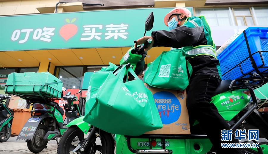 一名外送員從叮咚買菜上海浦東云山路前置倉出發(fā)送貨(4月17日攝)。新華社記者方喆攝
