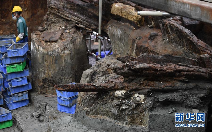 這是位于廣東陽江海陵島的“南海I號(hào)”已清理出的船艉部分(5月12日攝)。新華社記者鄧華攝