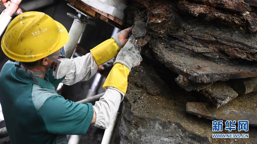 在廣東陽(yáng)江海陵島,工作人員在“南海I號(hào)”發(fā)掘現(xiàn)場(chǎng)進(jìn)行清理工作(5月12日攝)。新華社記者鄧華攝