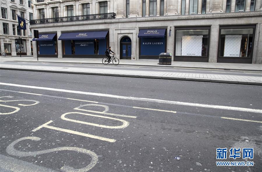 5月12日,在英國倫敦,一名男子騎行經(jīng)過攝政街關(guān)閉的店鋪。新華社記者韓巖攝
