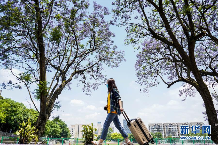 5月15日,西南大學(xué)校園內(nèi)的藍(lán)花楹樹下,一名學(xué)生拖著行李箱向宿舍走去。當(dāng)日,重慶西南大學(xué)迎來(lái)疫情以來(lái)首批返校大學(xué)生。據(jù)介紹,按照疫情防控的需要,重慶市高校2020年春季學(xué)期從5月11日起按照“一校一策”原則,實(shí)行錯(cuò)峰錯(cuò)時(shí)分批次有序開學(xué)復(fù)課。新華社記者劉潺攝