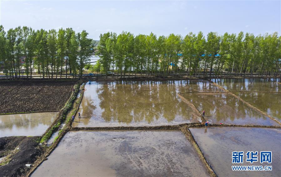 5月17日,在吉林省長春市雙陽區(qū)徐家村,農(nóng)民在水稻田間耕作(無人機照片)。新華社記者許暢攝