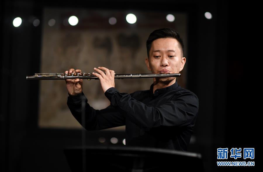 在陜西歷史博物館唐代壁畫珍品館,西安交響樂團長笛首席孫丁為“云上國寶”音樂會彩排(5月14日攝)。為迎接國際博物館日,5月14日,西安交響樂團走進陜西歷史博物館唐代壁畫珍品館,為5月18日的“云上國寶”音樂會彩排。觀眾將通過網絡直播,在聆聽天籟的同時欣賞國之瑰寶,感受藝術與美的和諧共鳴。新華社記者李一博攝