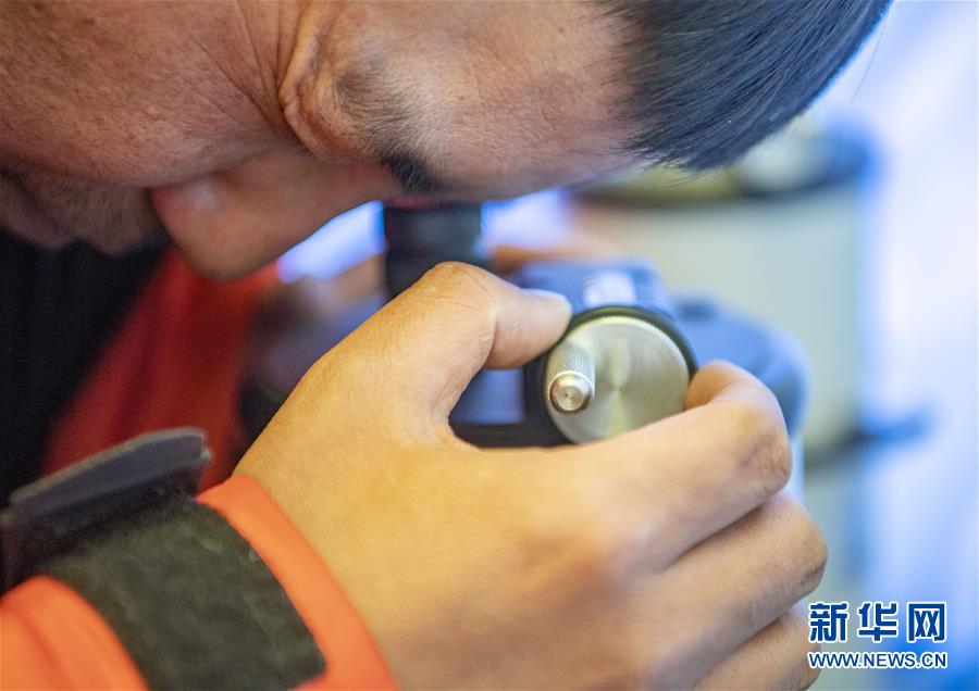 國測(cè)一大隊(duì)隊(duì)員在珠峰大本營測(cè)試地面測(cè)量中使用的重力儀(5月3日攝)。新華社記者晉美多吉攝