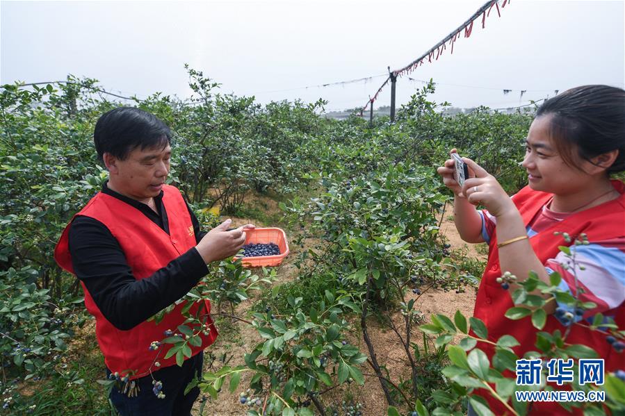 5月20日,長興縣林城鎮(zhèn)上獅村的藍(lán)莓種植幫扶基地內(nèi),青年志愿者與種植戶通過手機(jī)直播藍(lán)莓的采摘,并介紹當(dāng)?shù)厮{(lán)莓生長環(huán)境和品質(zhì),進(jìn)行網(wǎng)上銷售。新華社記者徐昱攝