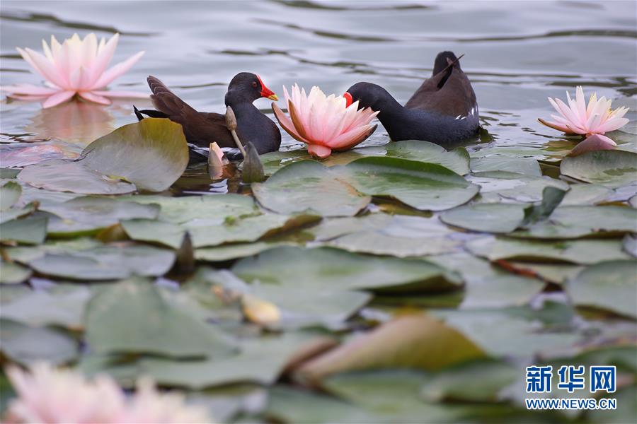 5月22日,兩只紅嘴水雞在蓮葉間覓食。近日,貴陽(yáng)市觀山湖公園內(nèi)大片盛開的蓮花吸引了不少水鳥在其間嬉戲覓食。新華社記者劉續(xù)攝