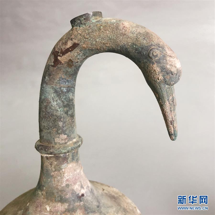 發(fā)掘出土的鵝首曲頸青銅壺(5月22日攝)。新華社記者李麗靜攝
