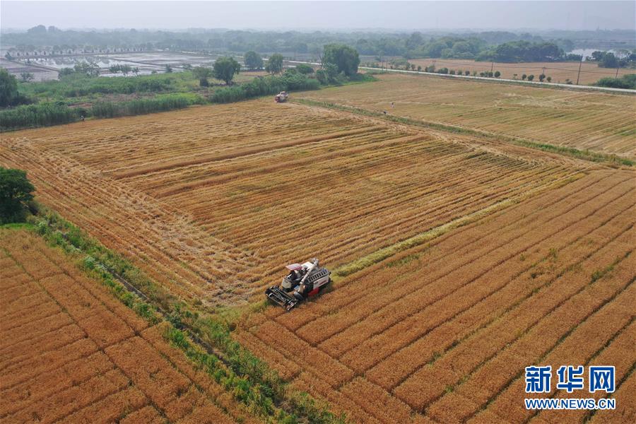 5月24日,農戶駕駛收割機在浙江省湖州市吳興區(qū)八里店鎮(zhèn)尹家圩糧油植保農機專業(yè)合作社的麥田里進行收割作業(yè)(無人機照片)。新華社記者黃宗治攝