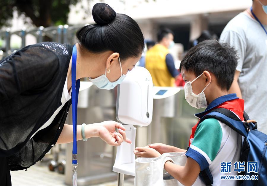 5月25日,廣州市荔灣區(qū)蔣光鼐紀念小學(xué)的老師在校門口指導(dǎo)返校的學(xué)生進行手部消毒。當(dāng)日,廣州市各小學(xué)一至三年級學(xué)生正式開學(xué)復(fù)課。至此,廣州市中小學(xué)各年級已全部開學(xué)復(fù)課。新華社記者盧漢欣攝