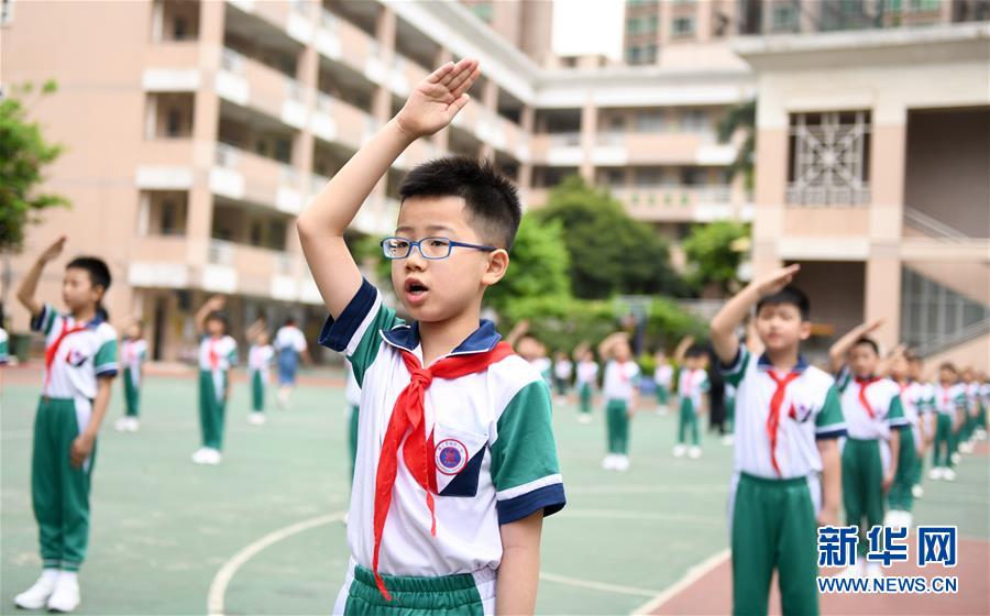 5月25日,廣州市荔灣區(qū)蔣光鼐紀(jì)念小學(xué)的學(xué)生在參加升國(guó)旗唱國(guó)歌儀式。當(dāng)日,廣州市各小學(xué)一至三年級(jí)學(xué)生正式開學(xué)復(fù)課。至此,廣州市中小學(xué)各年級(jí)已全部開學(xué)復(fù)課。新華社記者盧漢欣攝