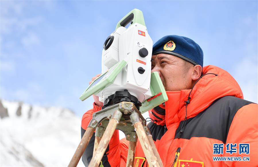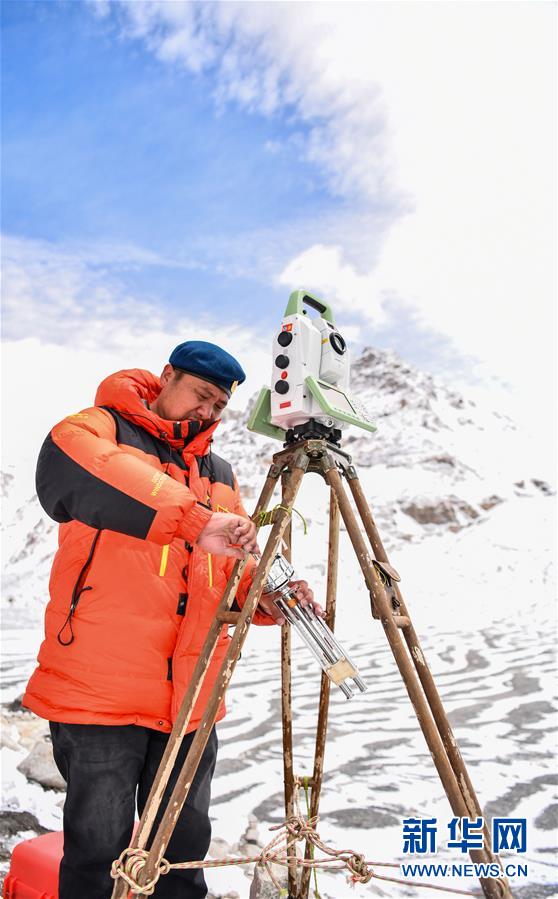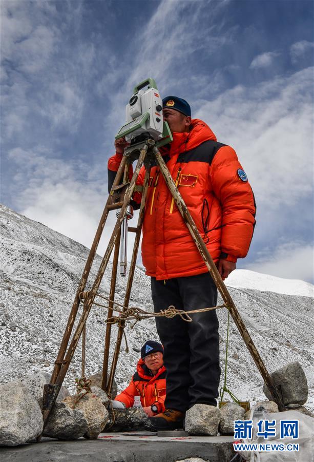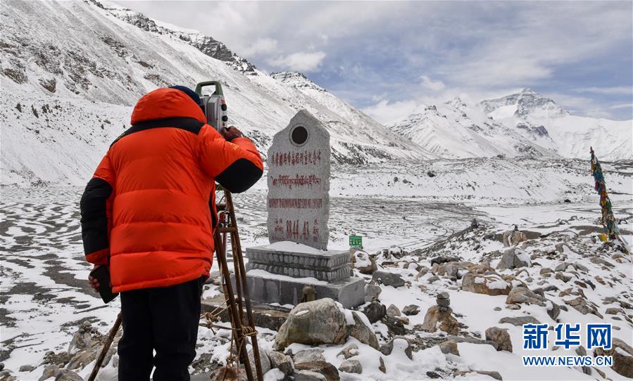 當(dāng)日,2020珠峰高程測量登山隊成功登頂后,在珠峰大本營的珠峰高程起算點,自然資源部第一大地測量隊隊員利用全站儀等儀器對珠穆朗瑪峰峰頂進(jìn)行交會觀測。