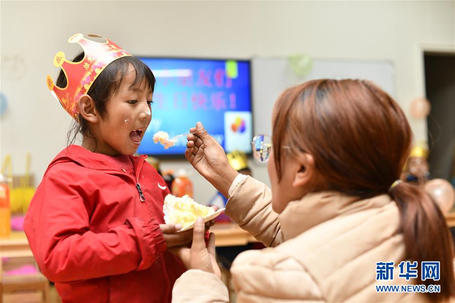 5月27日,玉麥鄉(xiāng)小學(xué)的老師給孩子喂蛋糕。新華社記者王炳坤攝