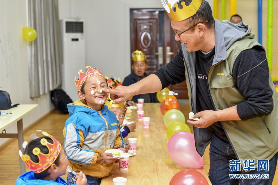 5月27日,玉麥鄉(xiāng)小學(xué)校長朗杰和孩子們一起慶?!吧铡薄P氯A社記者王炳坤攝