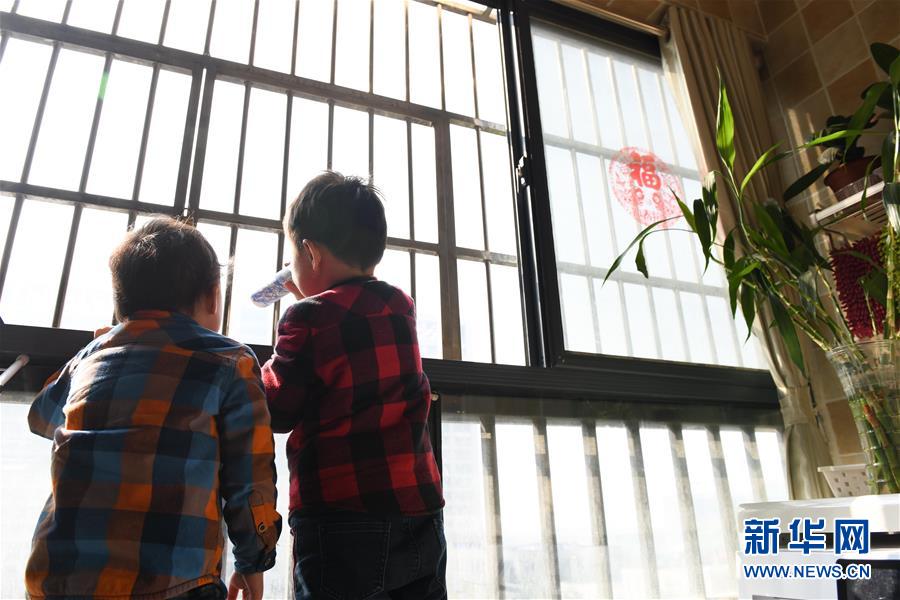 合肥第二人民醫(yī)院附近,兒子在家中陽臺手持自制“放大鏡”,眺望在對面醫(yī)院“打病毒”的護士媽媽(2月3日攝)。新華社記者張端攝