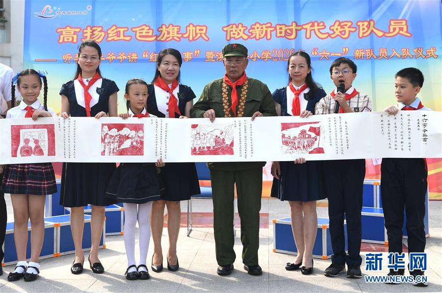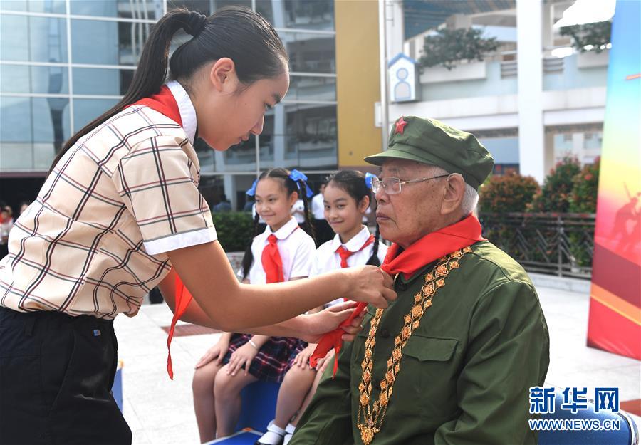 5月29日,少先隊員給李延年戴上紅領(lǐng)巾?!傲弧眹H兒童節(jié)來臨之際,“共和國勛章”獲得者、老一輩戰(zhàn)斗英雄李延年來到廣西南寧市濱湖路小學(xué)給孩子們講述戰(zhàn)爭年代的紅色故事,寄語他們好好學(xué)習(xí)、努力奮斗。孩子們向李延年贈送了師生共繪的“紅色畫卷”,向老英雄致敬。新華社記者周華攝