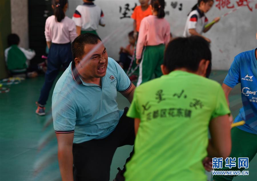 七星小學(xué)跳繩隊教練賴宣治(左)正大吼著激勵隊員訓(xùn)練。正是這位沒有接觸過專業(yè)跳繩訓(xùn)練的的體育老師把跳繩運(yùn)動引入學(xué)校,十年不懈,領(lǐng)著孩子們從鄉(xiāng)村的小操場跳到世界的大舞臺(2019年11月18日攝)。新華社記者劉大偉攝
