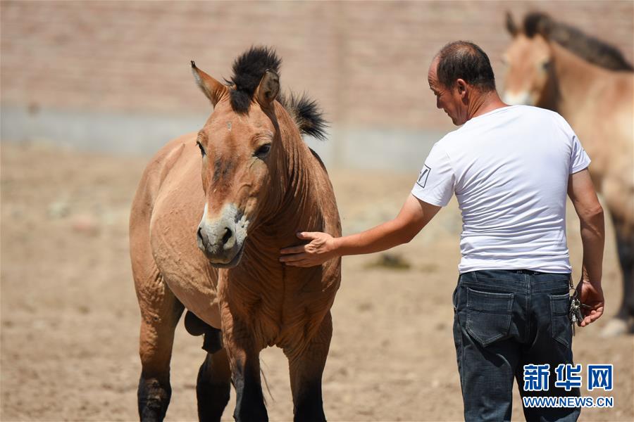6月2日,在新疆野馬繁殖研究中心,工作人員在查看野馬的身體狀況。新華社記者丁磊攝。