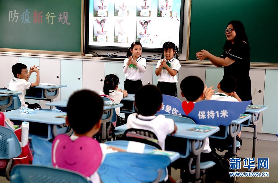 6月2日,上海閔行區(qū)鑫都小學(xué),老師指導(dǎo)一年級(jí)小學(xué)生如何正確洗手。當(dāng)日,上海小學(xué)一、二、三年級(jí)學(xué)生返校開學(xué)。新華社記者張建松攝。